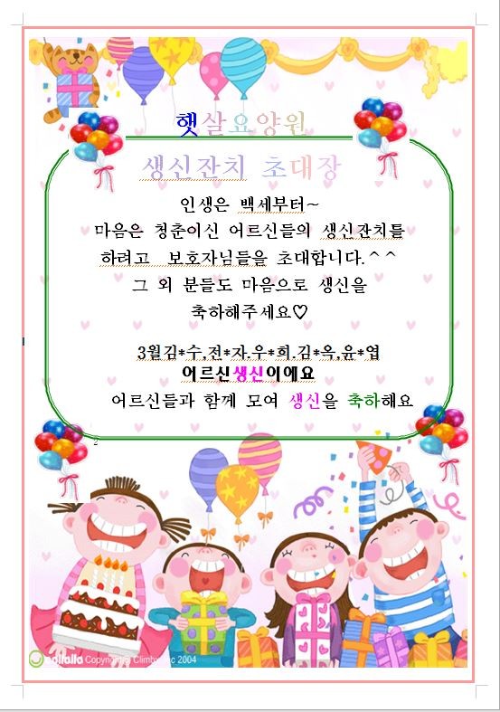 | 제목 | ♡ 햇살요양원 어르신 3월 생신잔치에 초대합니다.♡ | 공지일 | 2026.03.08 |